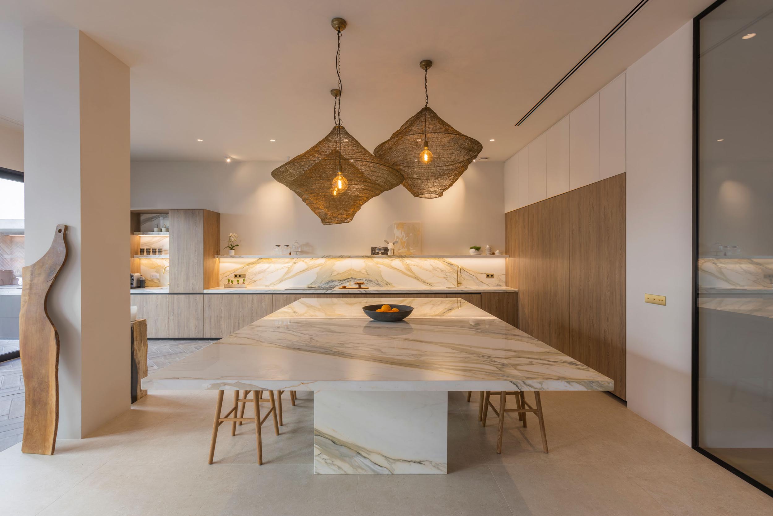 On this floor, you’ll find a living room, a gym, a massage room, and an indoor jacuzzi connected to the outdoor pool. The highlight is the impressive Calacatta marble island, ideal for hosting events and open house days. For this project, light tones were chosen to evoke a natural and serene atmosphere.