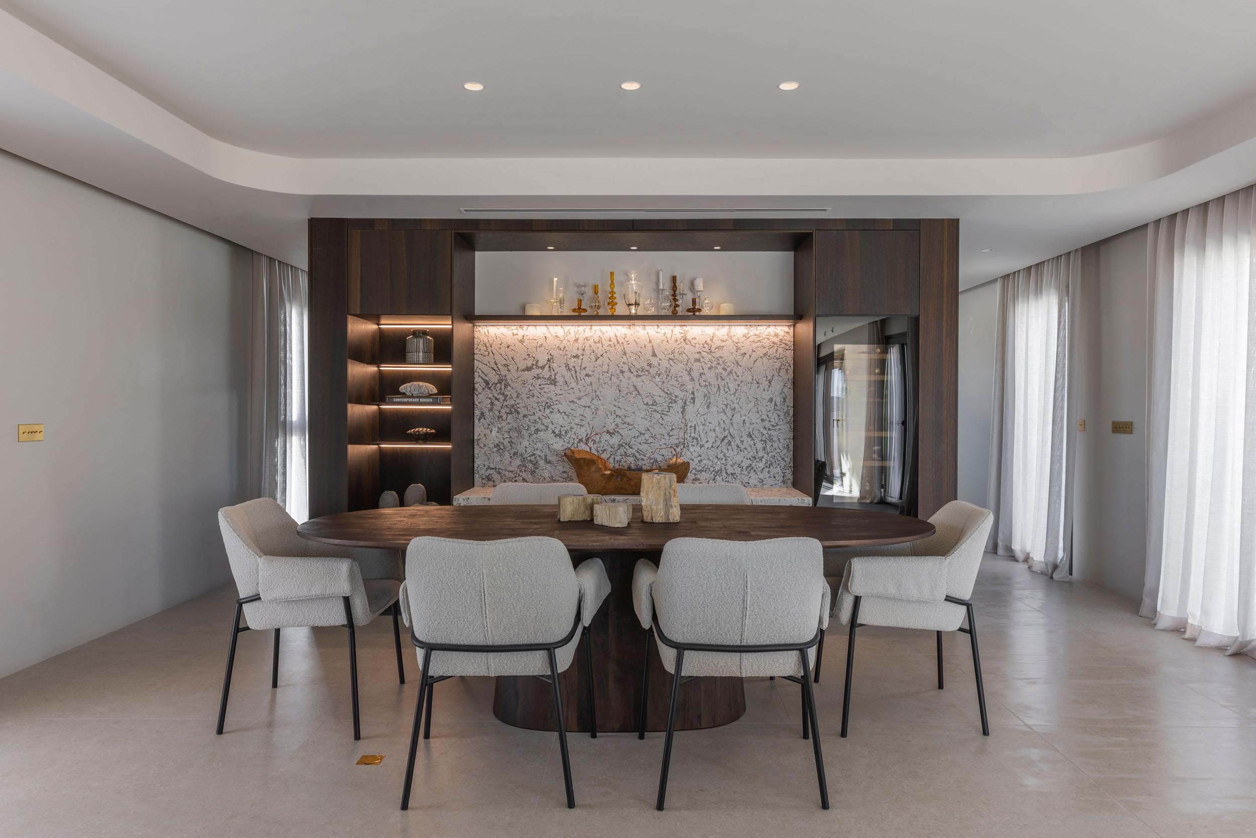 In the living area, there is a wine cellar and supporting furniture for the dining and living spaces, perfect for displaying decorative objects and art.