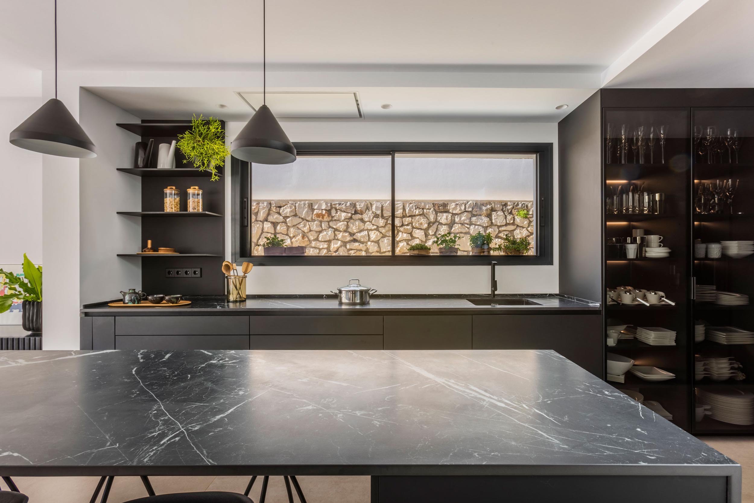 In this exclusive renovation in El Portet, the kitchen has been designed to blend naturally into the passageway leading to the living-dining area, making it feel like part of the furniture rather than a conventional kitchen. The chosen black color creates an elegant contrast with the bright white space and the rest of the furnishings.