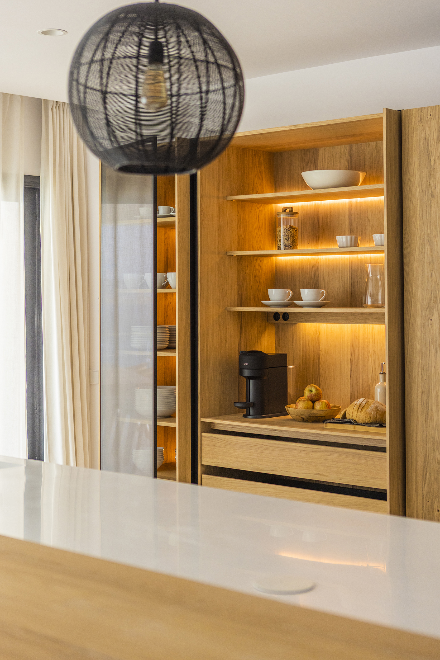 El diseño se divide en dos zonas diferenciadas. Una zona de columnas: Aquí, los electrodomésticos quedan completamente integrados gracias a módulos escamoteables para el horno, vinoteca y microondas. Dos columnas con puertas de vidrio rompen la uniformidad y aportan un aire más ligero y sofisticado, logrando que la cocina se perciba como un elegante mobiliario dentro del espacio abierto. Además, se incorpora un módulo escamoteable pensado como zona de desayuno.